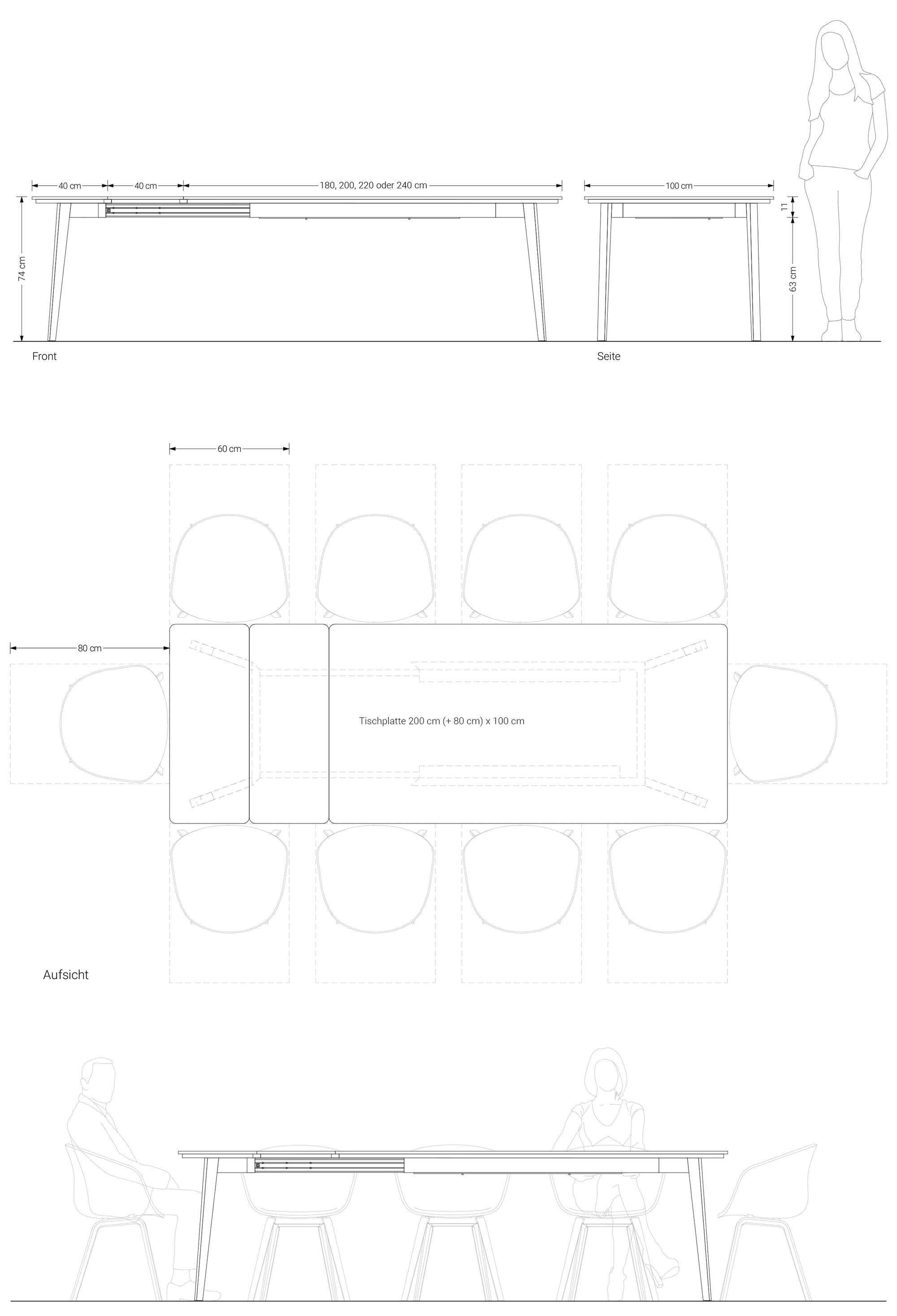 Durch das hochwertige, kugelgelagerte Auszugsystem aus Aluminium bietet der Esstisch mehr Platz, ohne an Stabilität zu verlieren.
