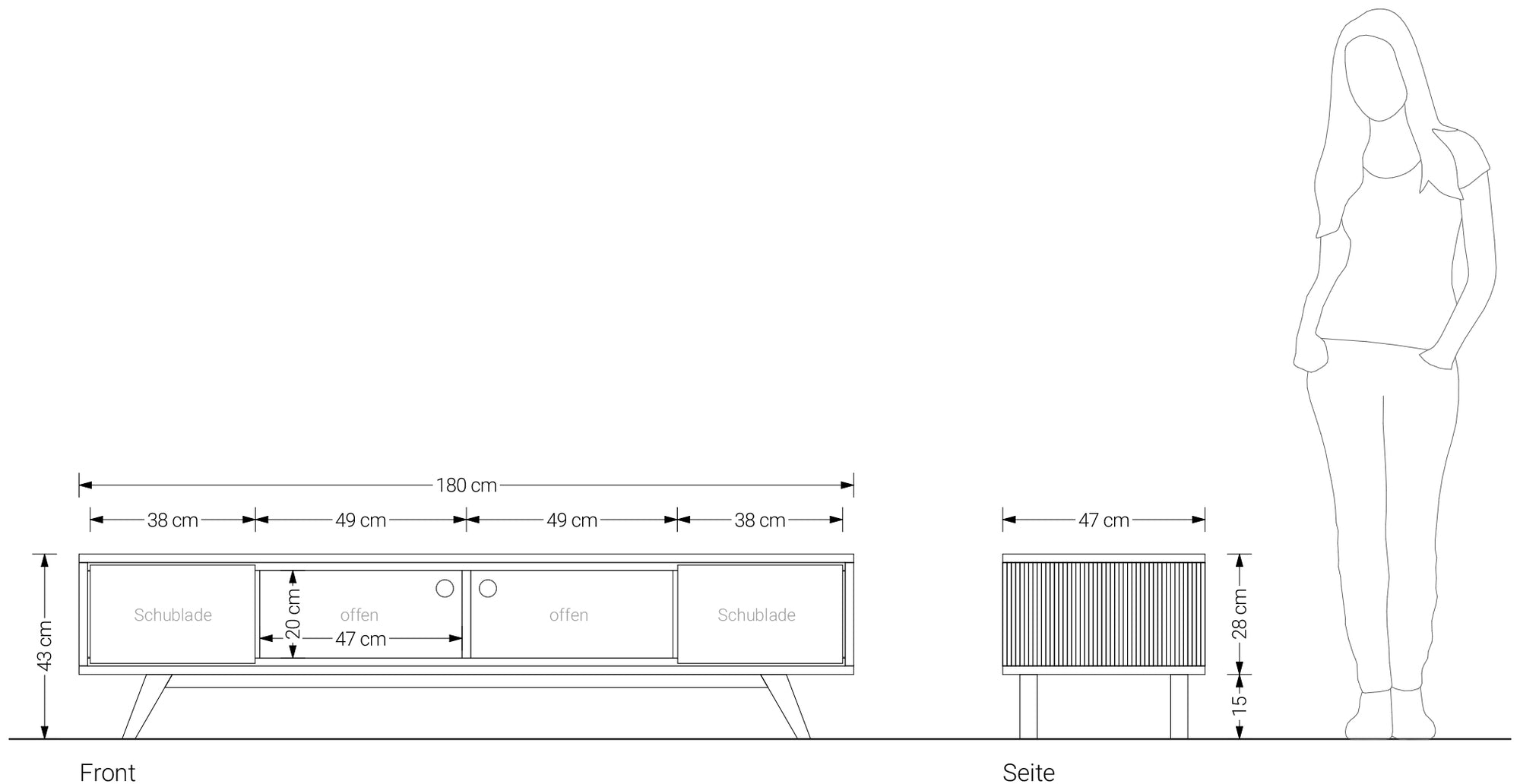 Die Oberfläche unseres Lowboards ist mit Öl behandelt, was nicht nur eine natürliche Haptik verleiht, sondern auch sehr pflegeleicht ist. Alternative Oberflächenbehandlung können gerne nach Wunsch umgesetzt werden.
