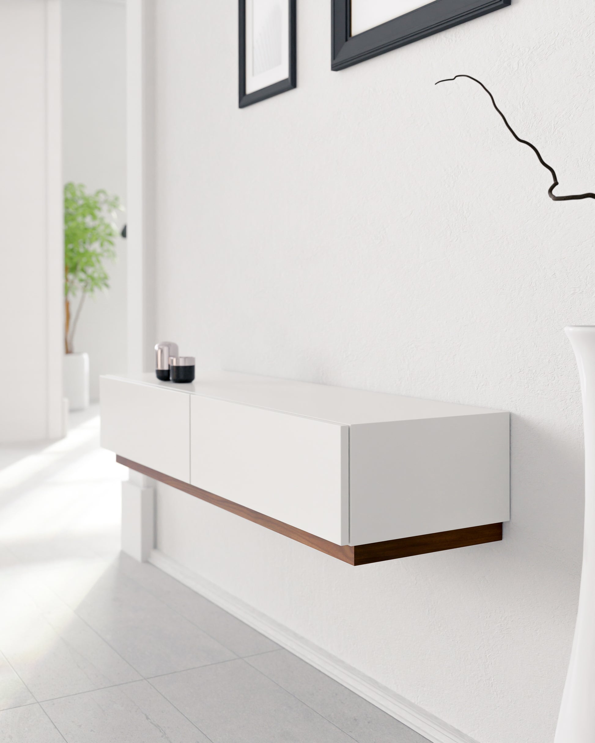 Mit dem Lowboard/Sideboard DOPPIA in weiß erhalten Sie ein exklusives Designer Stück für Ihre modernen Räumlichkeiten. Der Streifen aus amerikanischem Nussbaumholz verleiht dem Möbelstück einen klaren minimalistischen Stil.