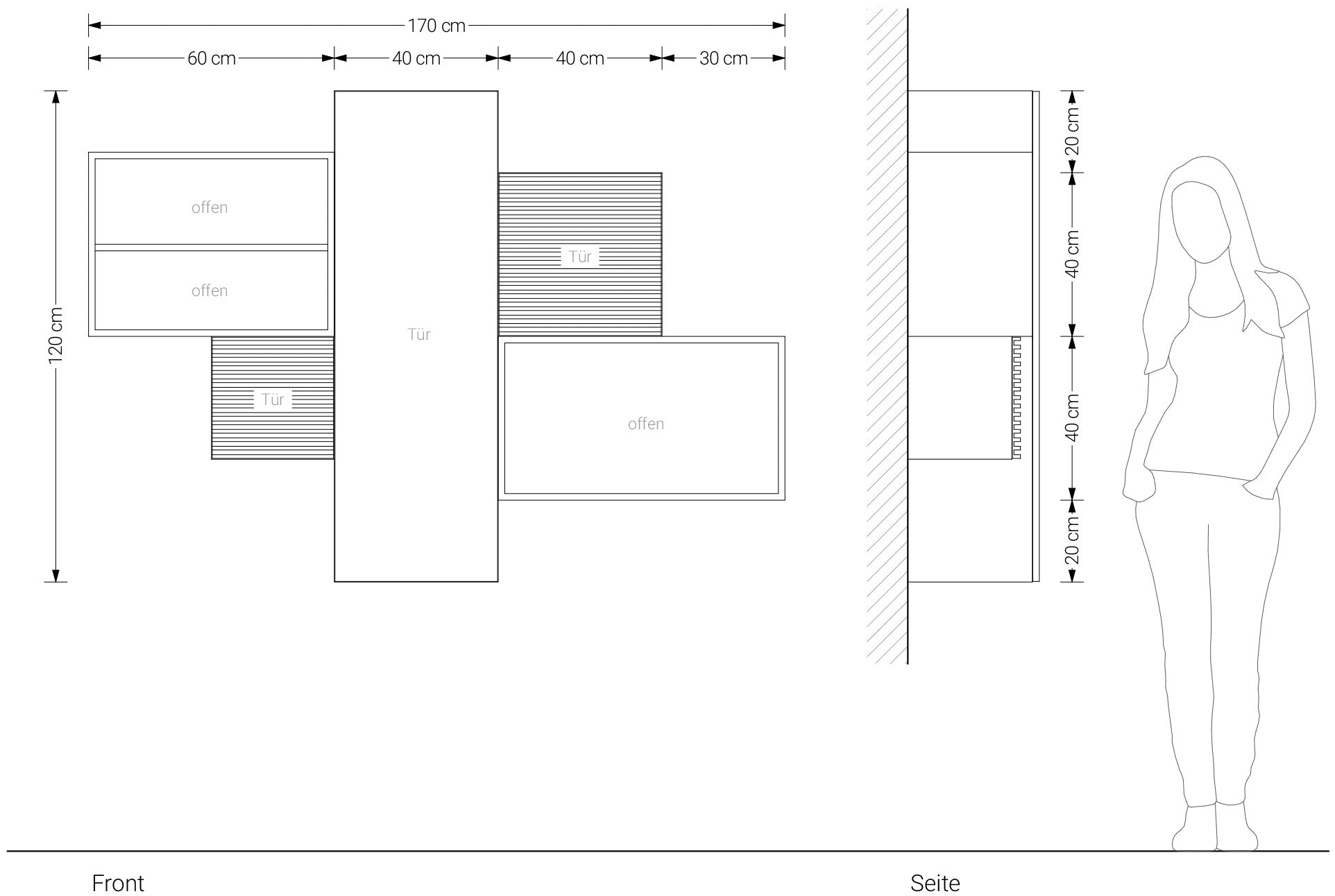 Das Wandregal GRANDE besteht aus fünf einzeln aufgehängten Einheiten. Auf geschickte Weise bricht dieses weiße Wandregal den sonst so geradlinigen Wohnraum. Die Front aus amerikanischem Nussbaumholz betont die besondere Wertigkeit dieses Möbelstücks.